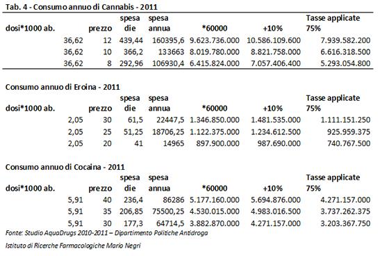 David e Ofria sono allievi di Mario Centorrino, economista messinese scomparso nell’agosto dello scorso anno. Sempre per laVoce.info, nel febbraio 2014 insieme hanno pubblicato uno studio che riguardava proprio l’effetto della cannabis sui conti pubblici. La nuova ricerca è adesso uno sviluppo di quel primo saggio. «Questa volta siamo andati più a fondo nella stima dei benefici economici - aggiunge David - calcolando gli introiti fiscali sulla base di un imponibile ottenuto moltiplicando il consumo medio degli stupefacenti per il costo di mercato». Partendo dallo studio Aqua Drugs, progetto del dipartimento Politiche Antidroga che misura l’uso degli stupefacenti attraverso l’analisi delle acque reflue, i due ricercatori presumono un consumo giornaliero di 36,62 dosi ogni mille abitanti. Moltiplicando per un prezzo che varia tra gli 8 e i 12 euro a dose, si ottiene una spesa annua che oscilla tra i 106.930 e i 160.395 euro. Che per il totale della popolazione nazionale (più una variabile del 10% che sfugge alle stime di Aqua Drug) compone una base imponibile tra i 7 e i 10,6 miliardi di euro.